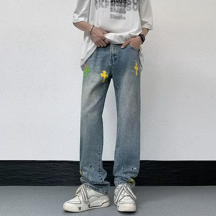 Peppen Sie Ihre Garderobe mit diesen VVS Splashed Ink Cross Embroidery Jeans auf. Mit einem auffälligen Denim-Design und einzigartigen gestickten Elementen bringen Sie Ihren Stil auf die nächste Ebene. Lassen Sie den Rebellen in sich frei und probieren Sie diese abenteuerlichen Jeans aus.